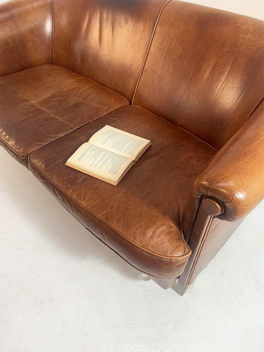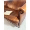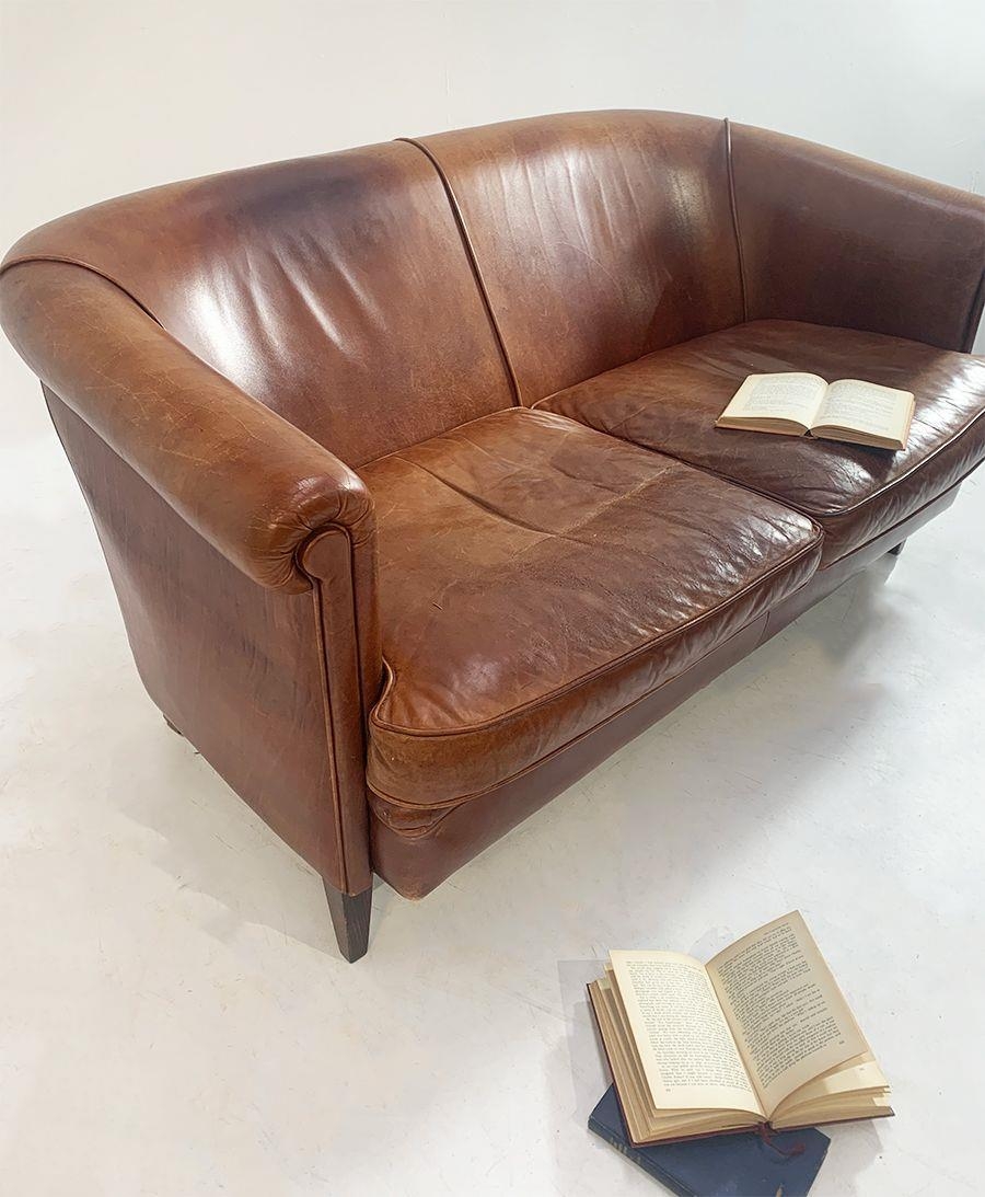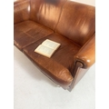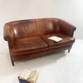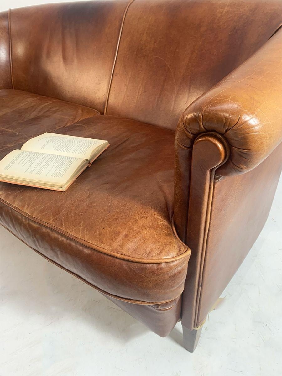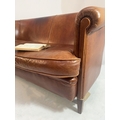 Vintage leather upholstered two seater sofa raised on square tapered legs. {80 cm H x 150 cm W x 90 cm D}.