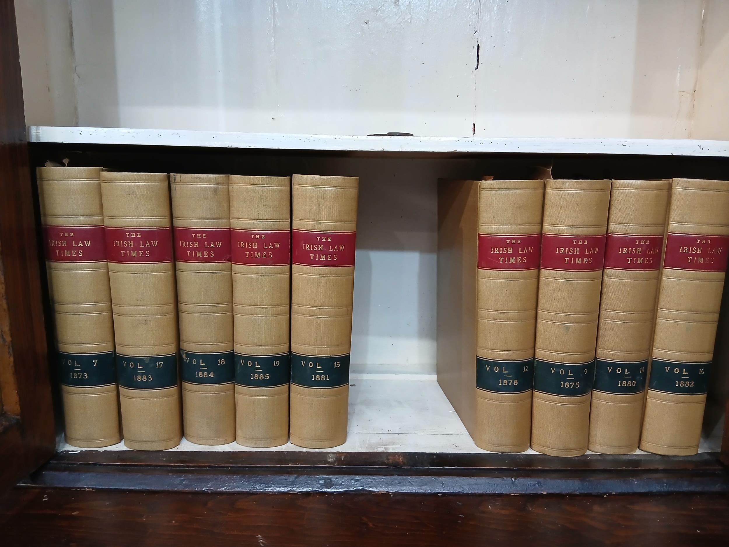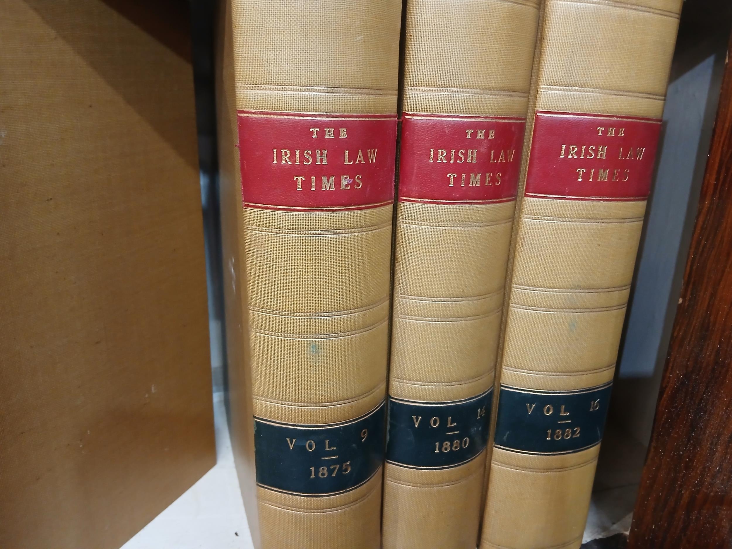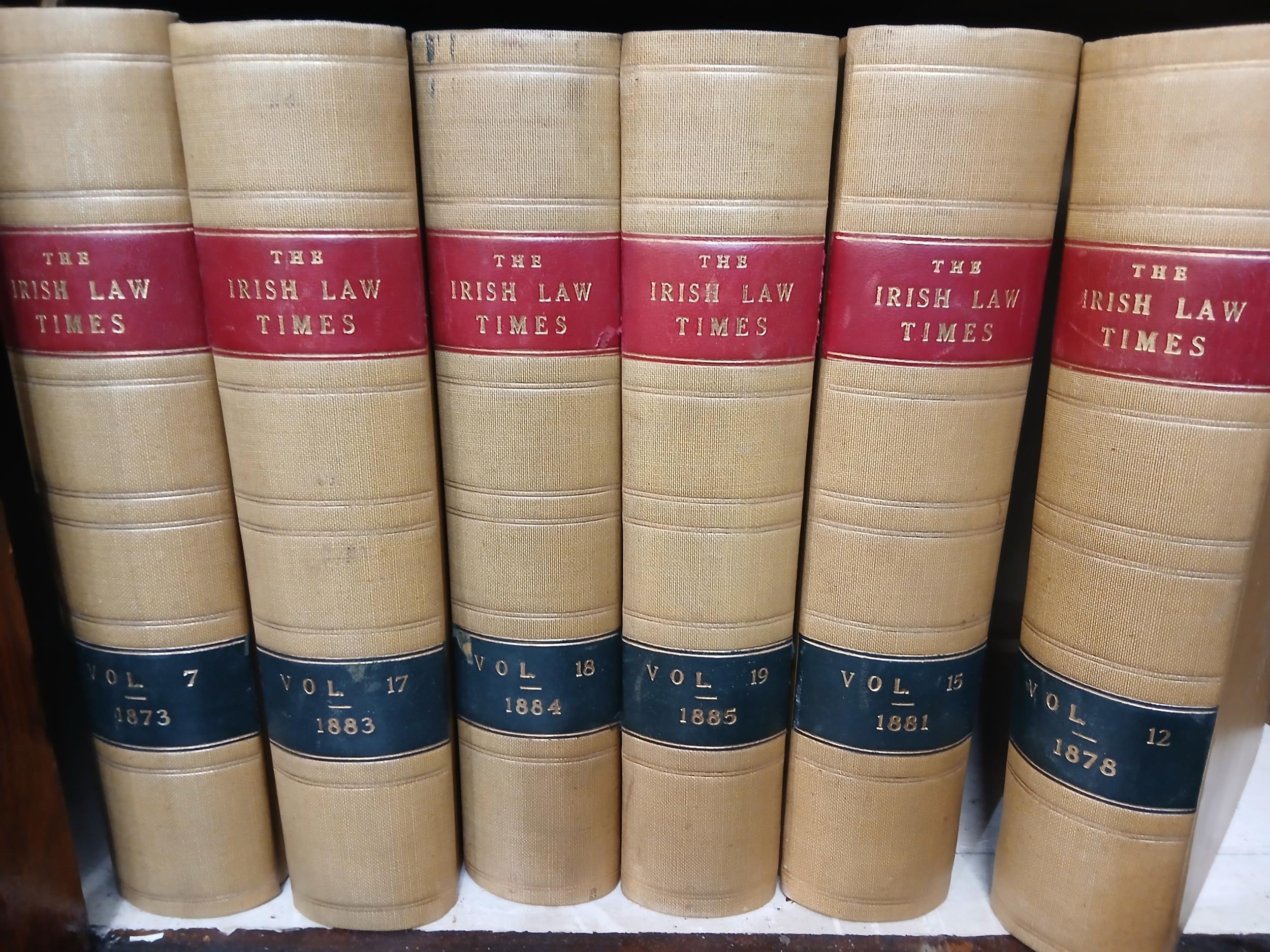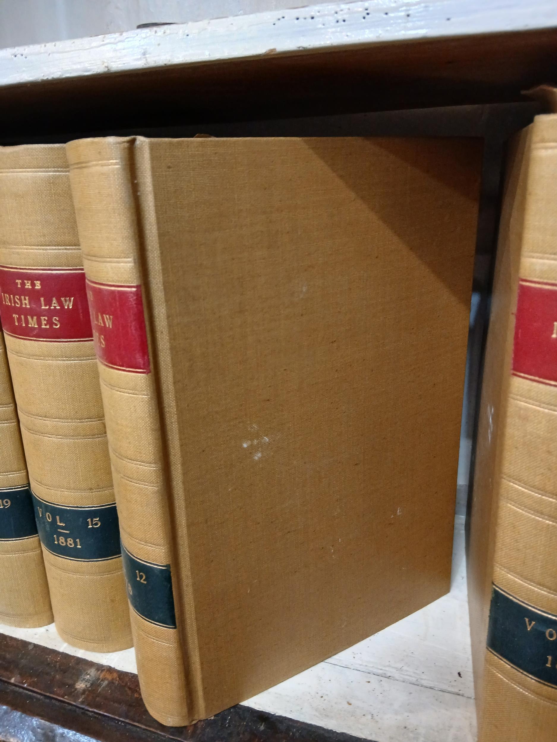 Set of nine Irish Law Times leather bound books. {H 25cm }. NOT AVAILABLE TO VIEW IN PERSON.