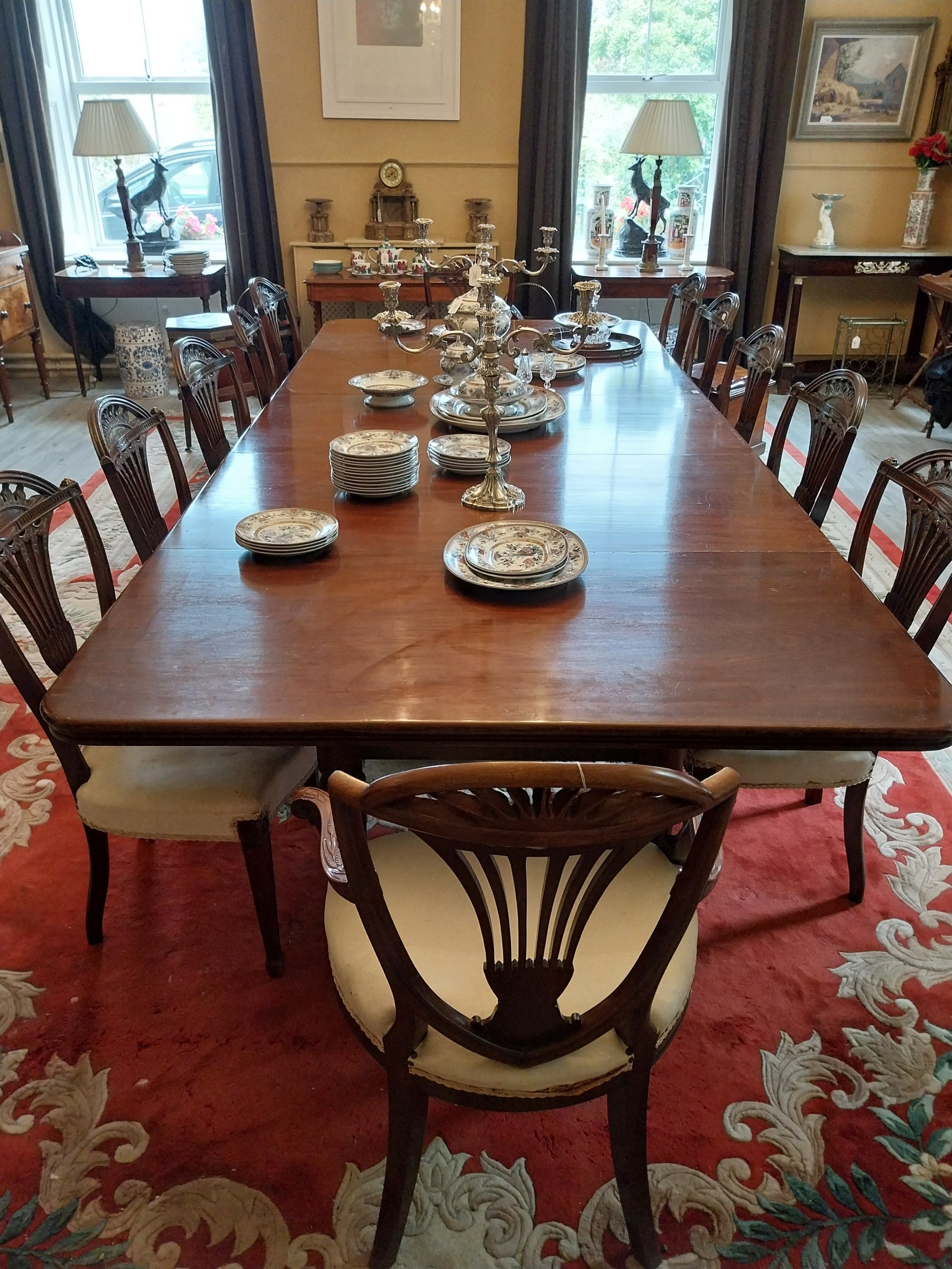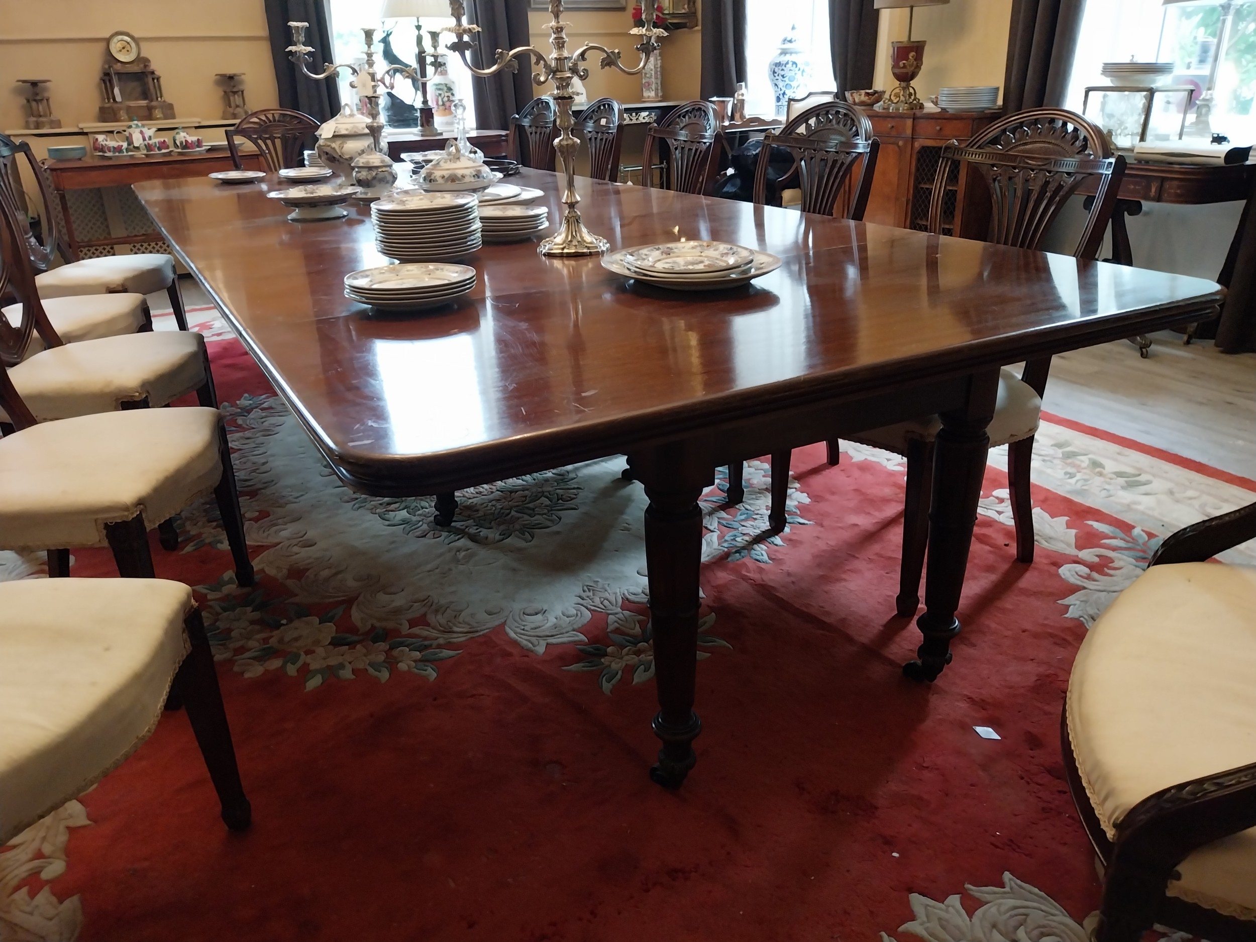 Good quality Will.IV. Mahogany dining room table, raised on tapered legs decorated with acanthus leaves. { 72cm H X 335cm W X 153cm D }.