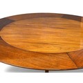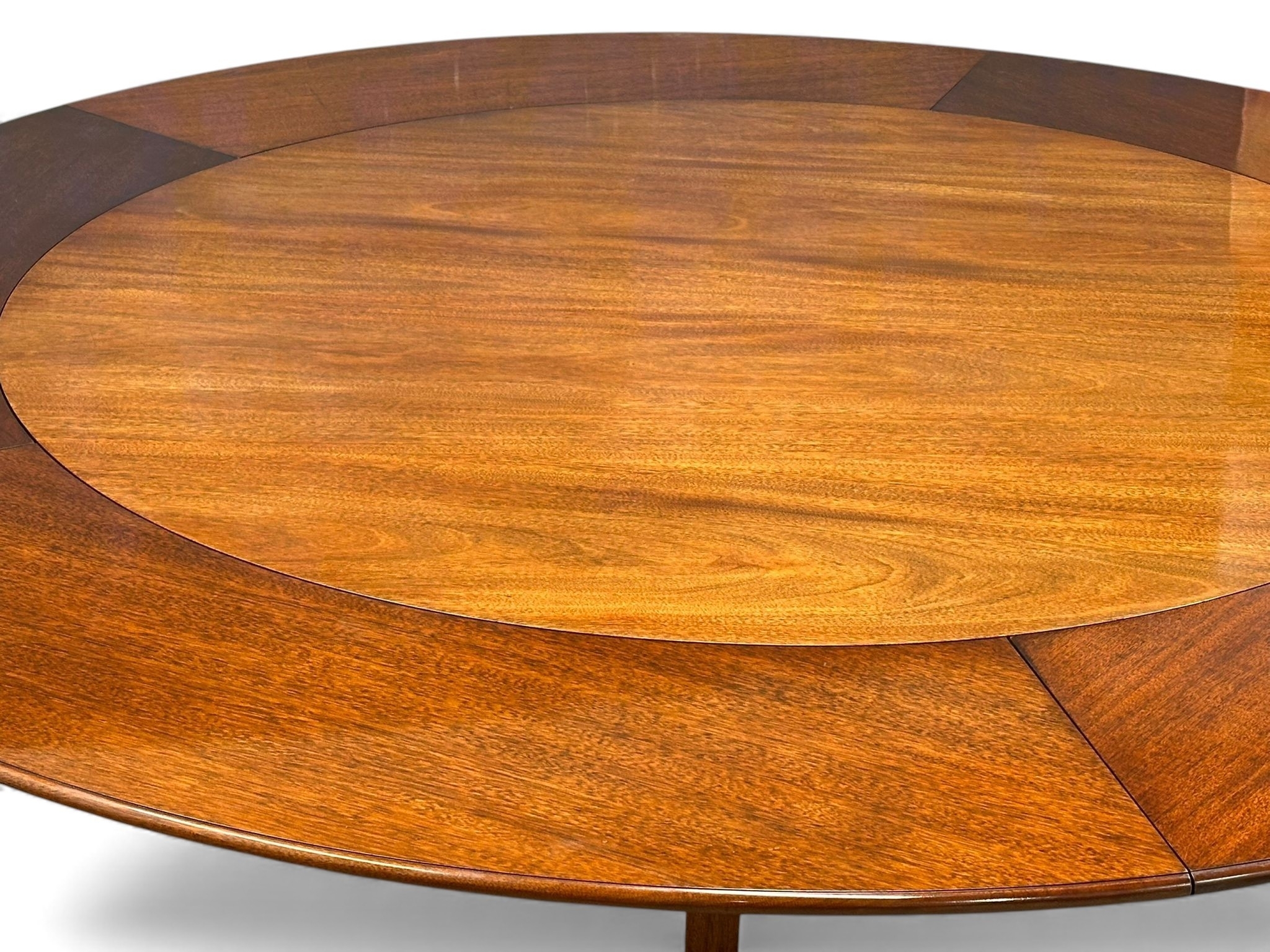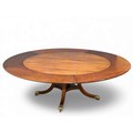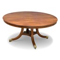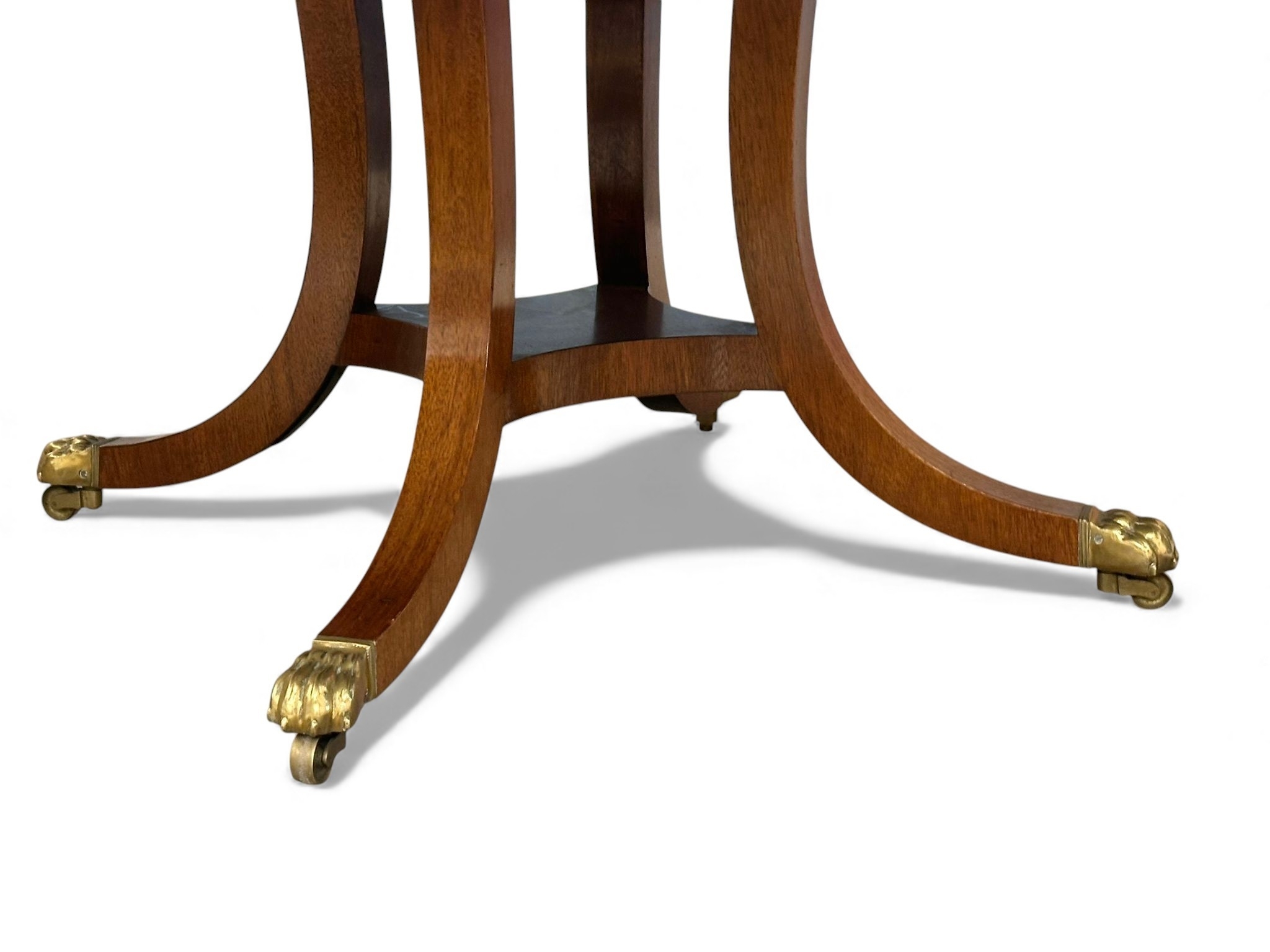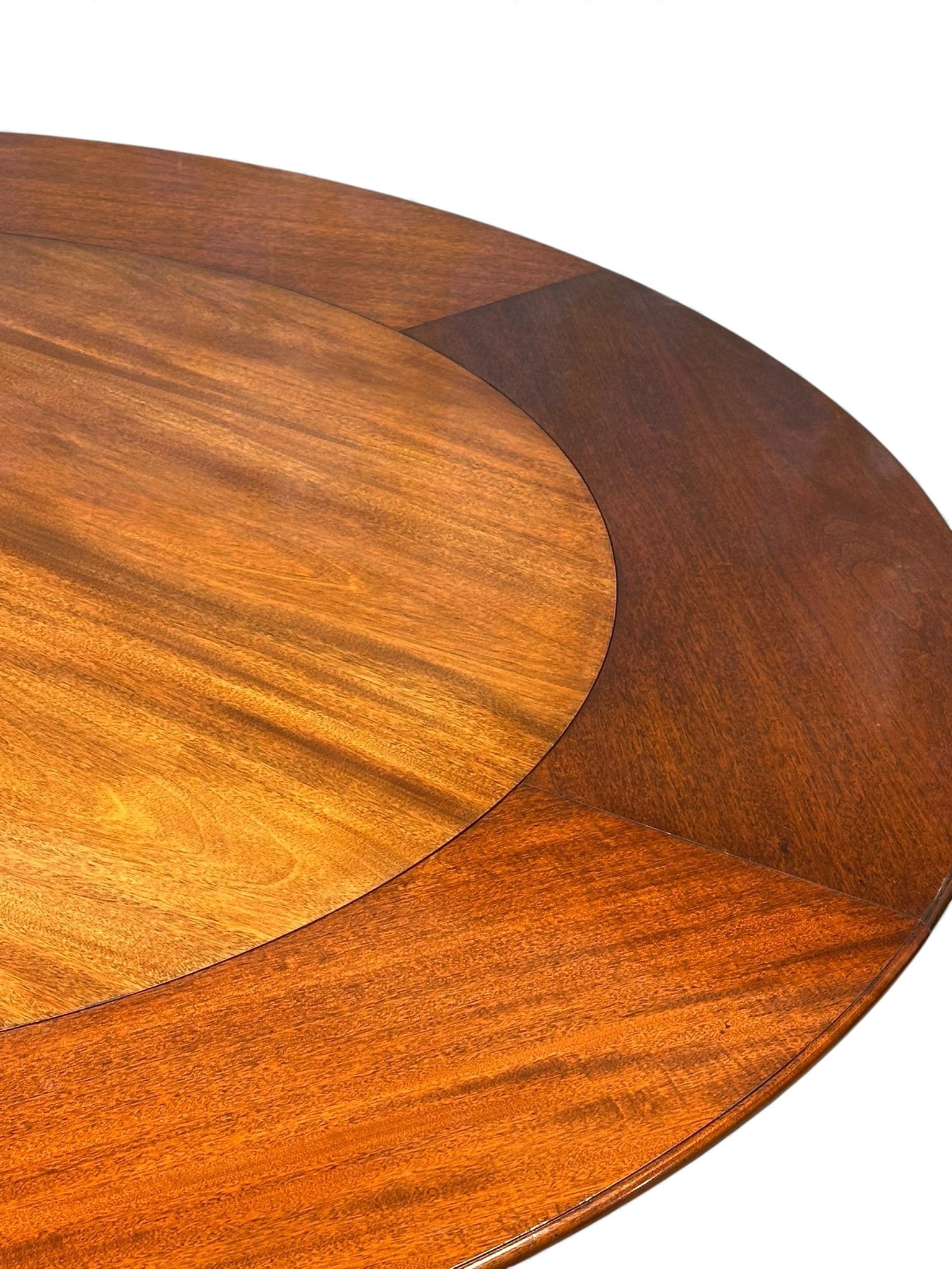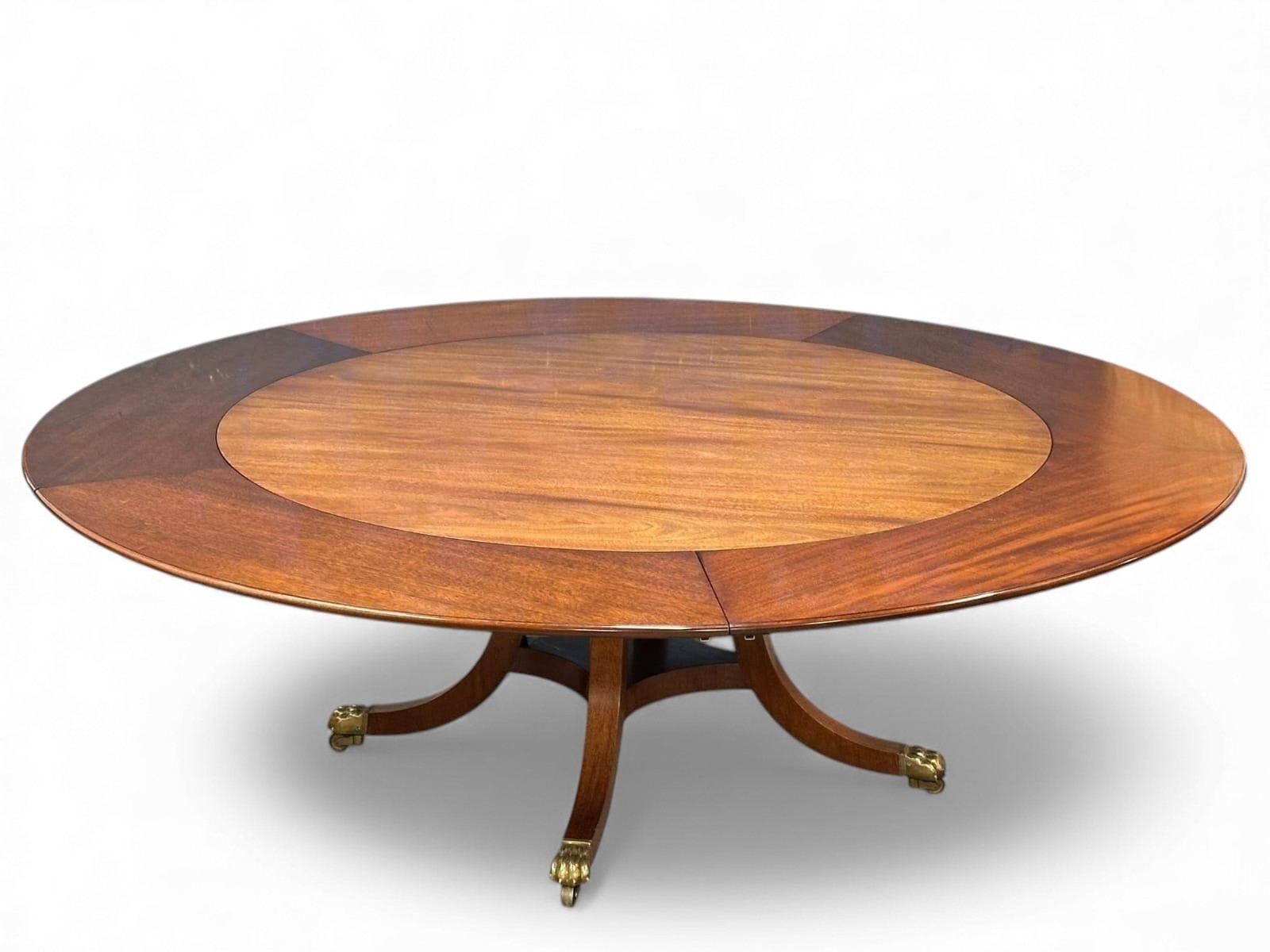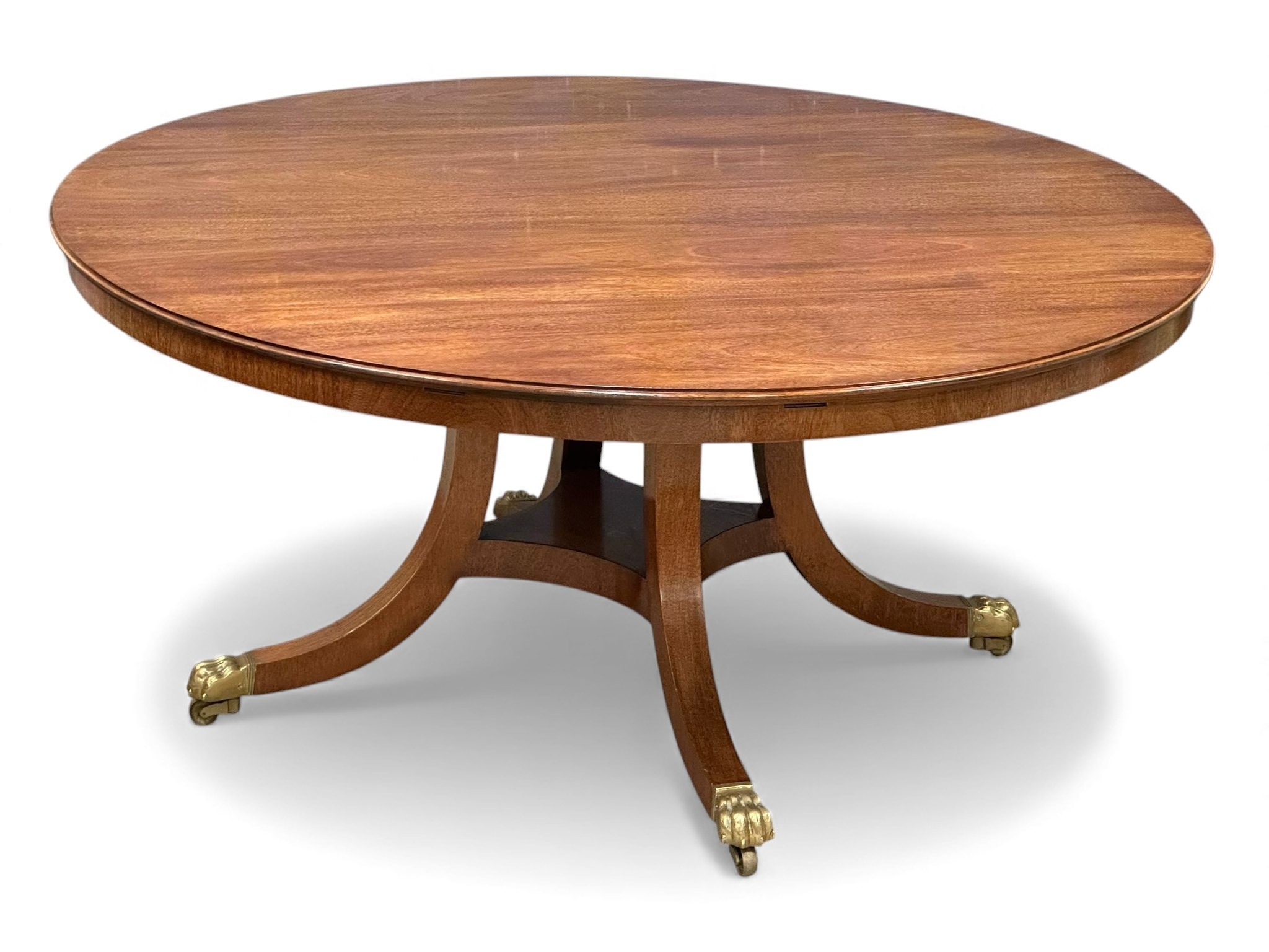 A large quality Georgian style mahogany circular Jupe table table with pedestal base and large brass lion paw feet. {71.5 cm H x 225 cm Dia.}.