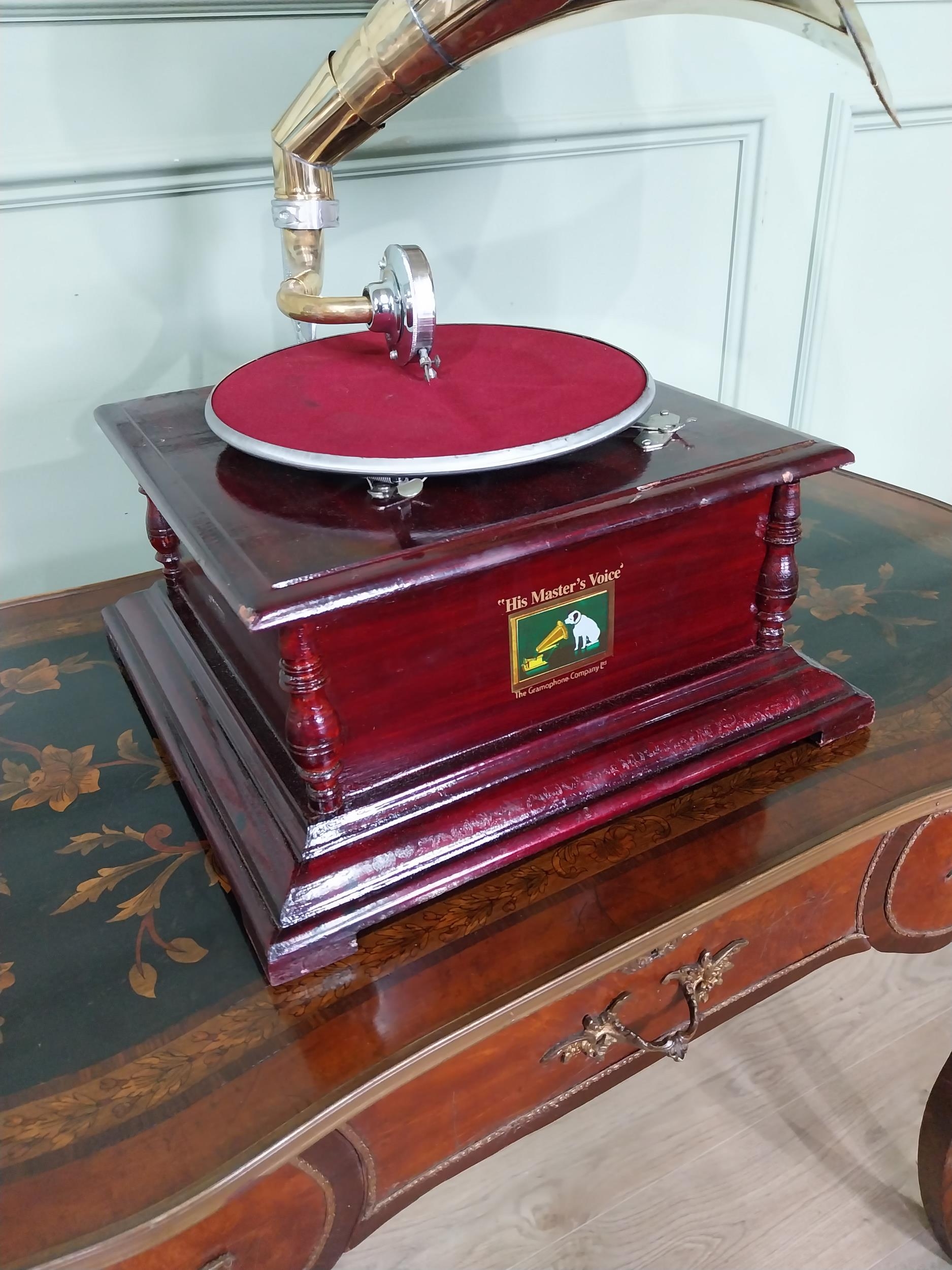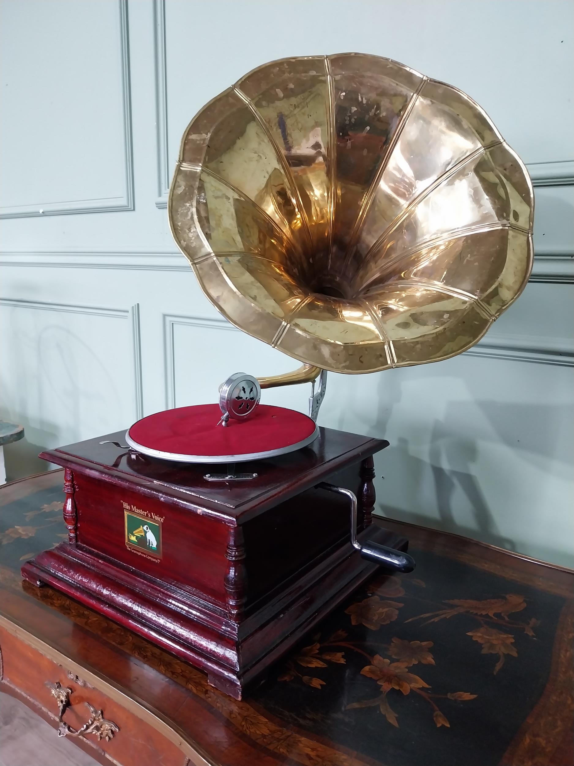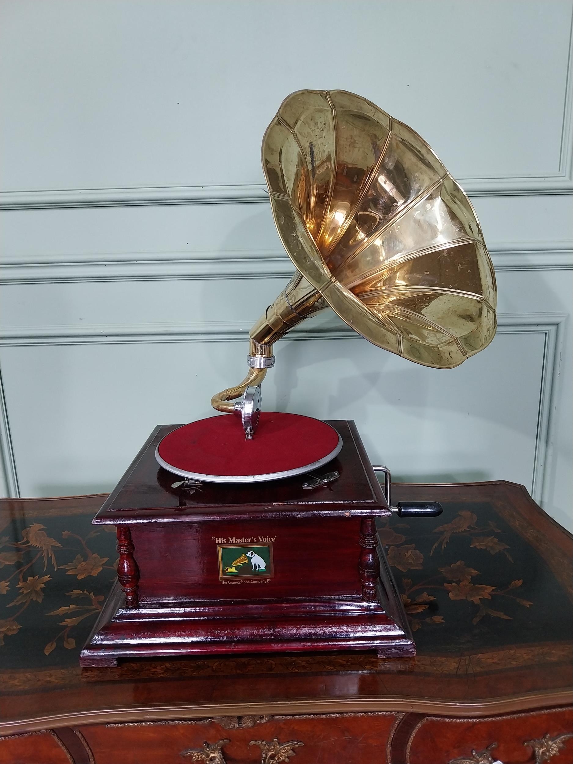 Vintage His Masters Voice stained pine gramaphone with brass horn. {66 cm H x 60 cm W x 44 cm D}.