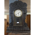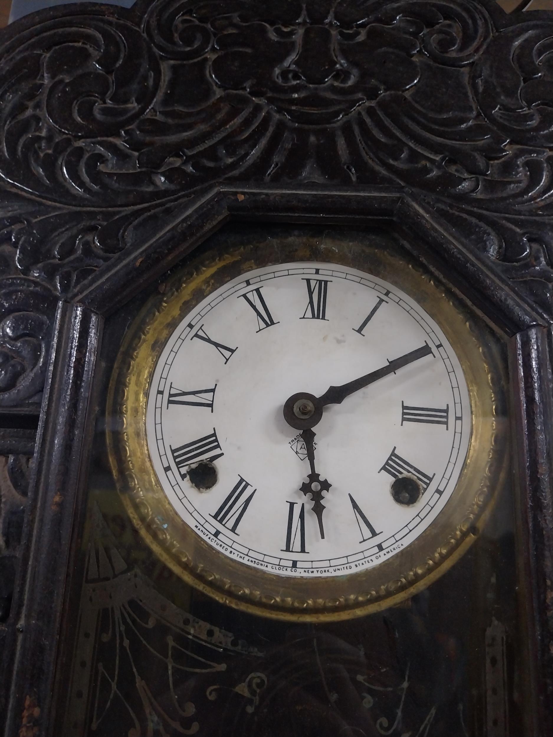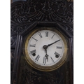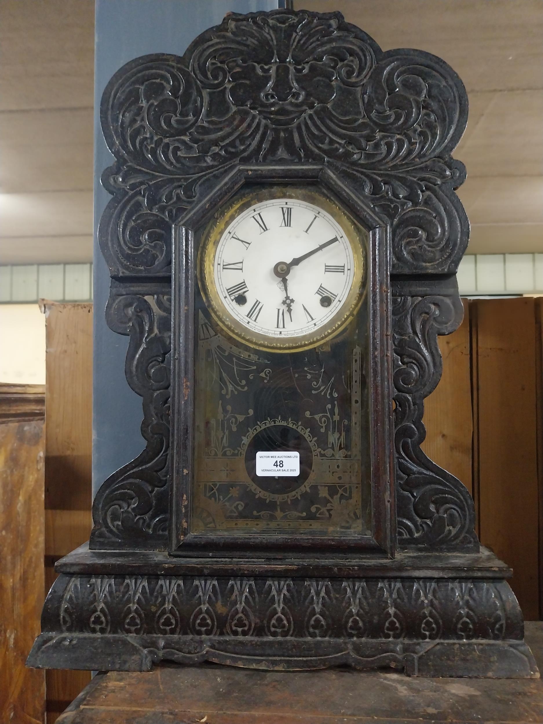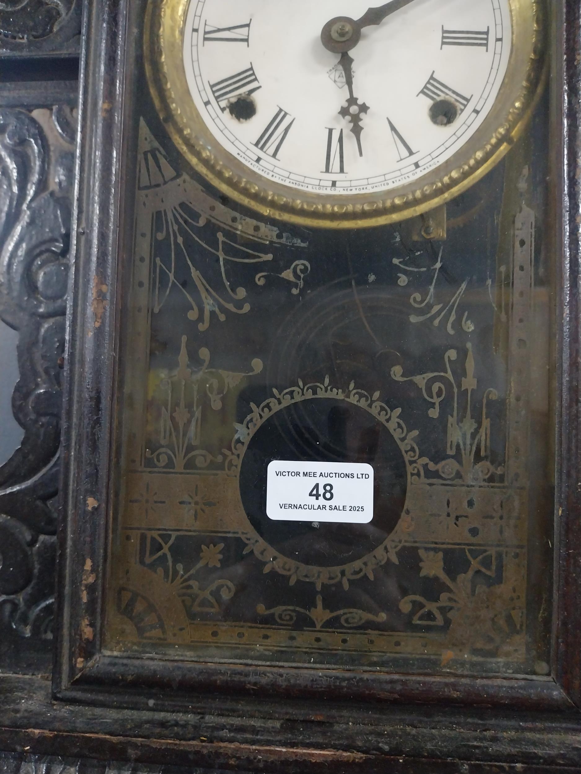 19th C. carved pine and ebonised ginger bread clock with enamel dial {61 cm H x 41 cm W x 11 cm D}.