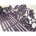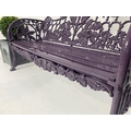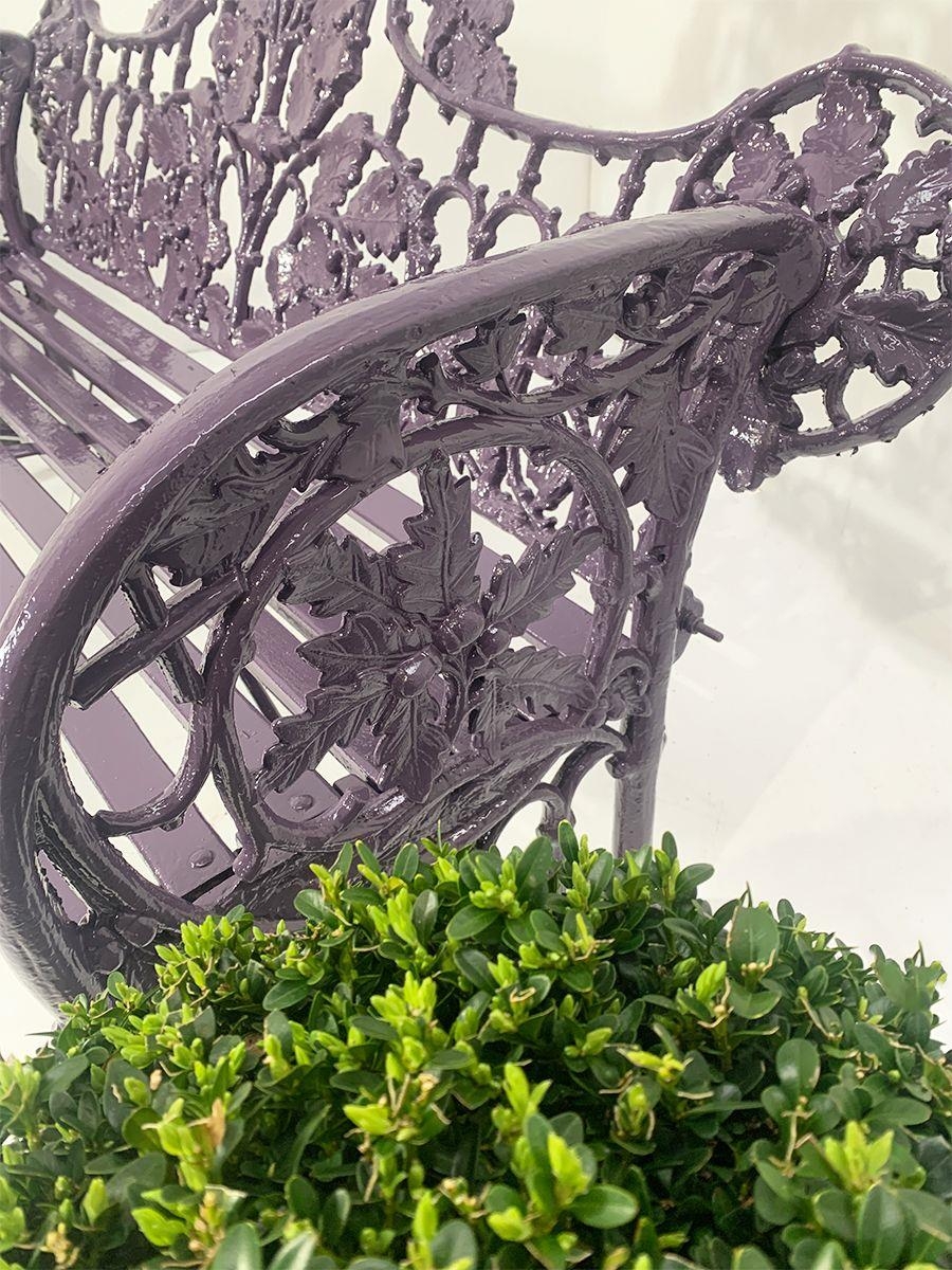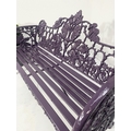 Cast iron two seater garden bench with curved arms and oak and ivy decoration in the Coalbrookdale style. {88 cm H x 135 cm W x 50 cm D}.