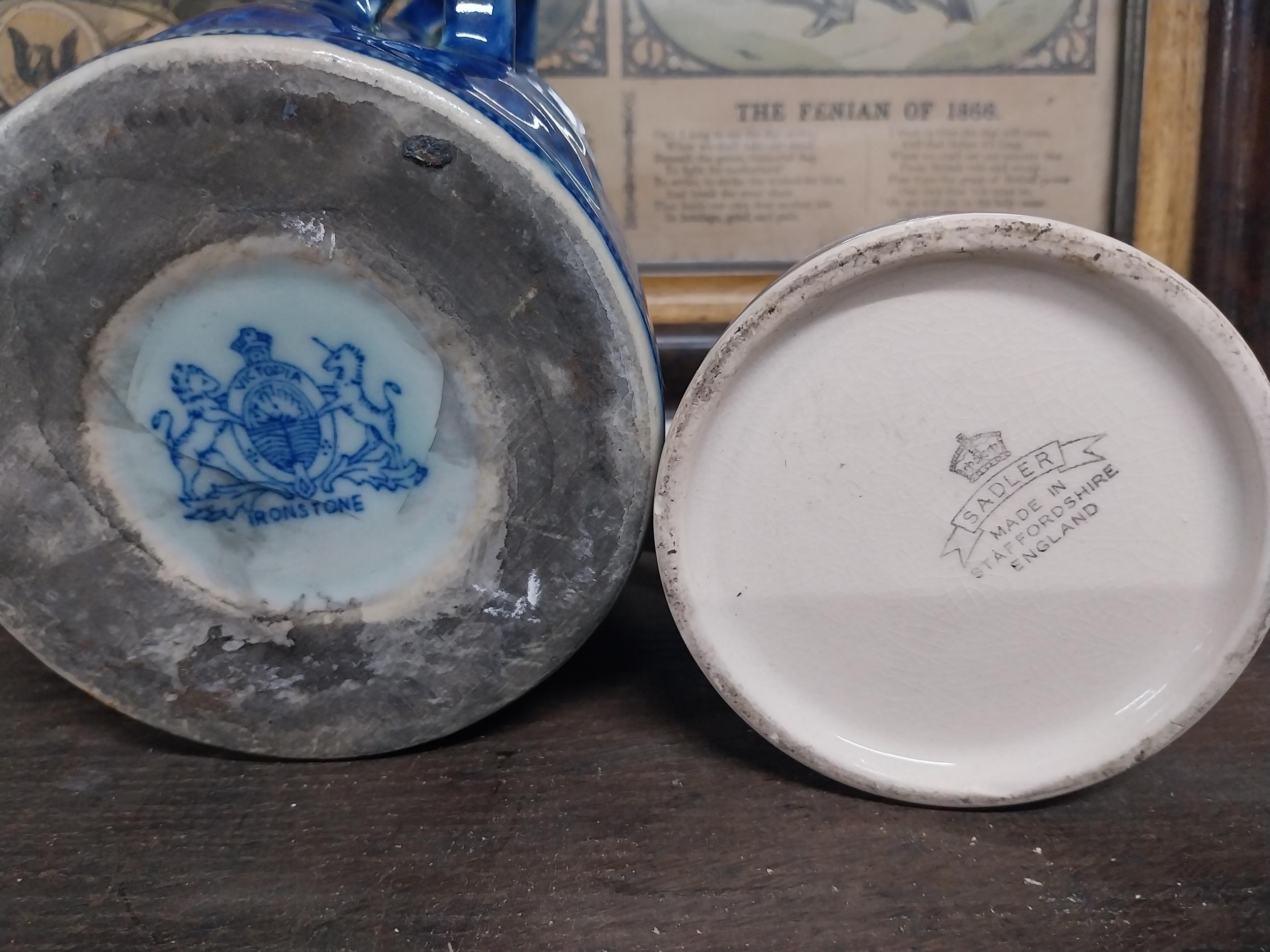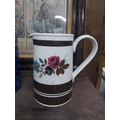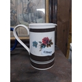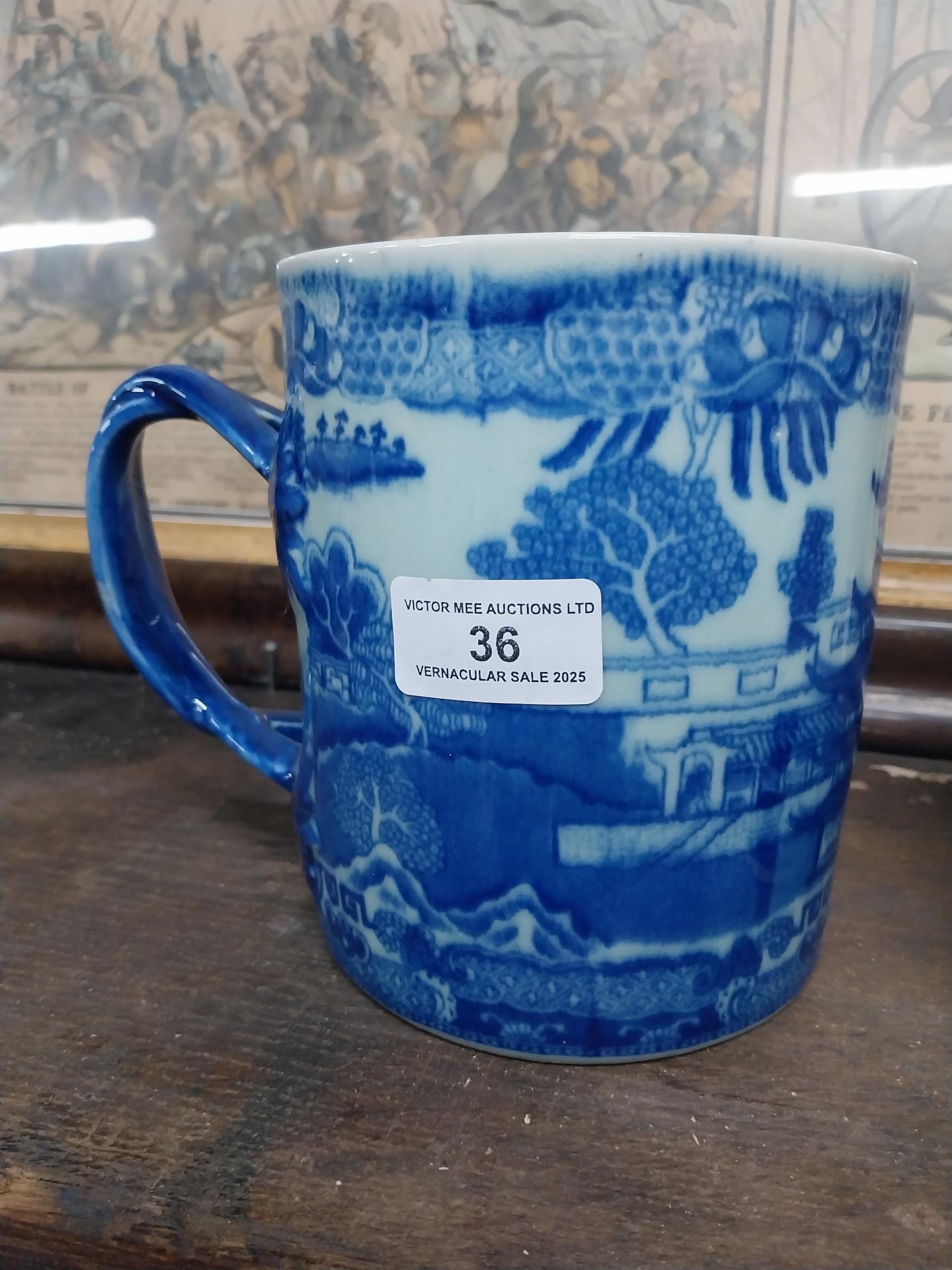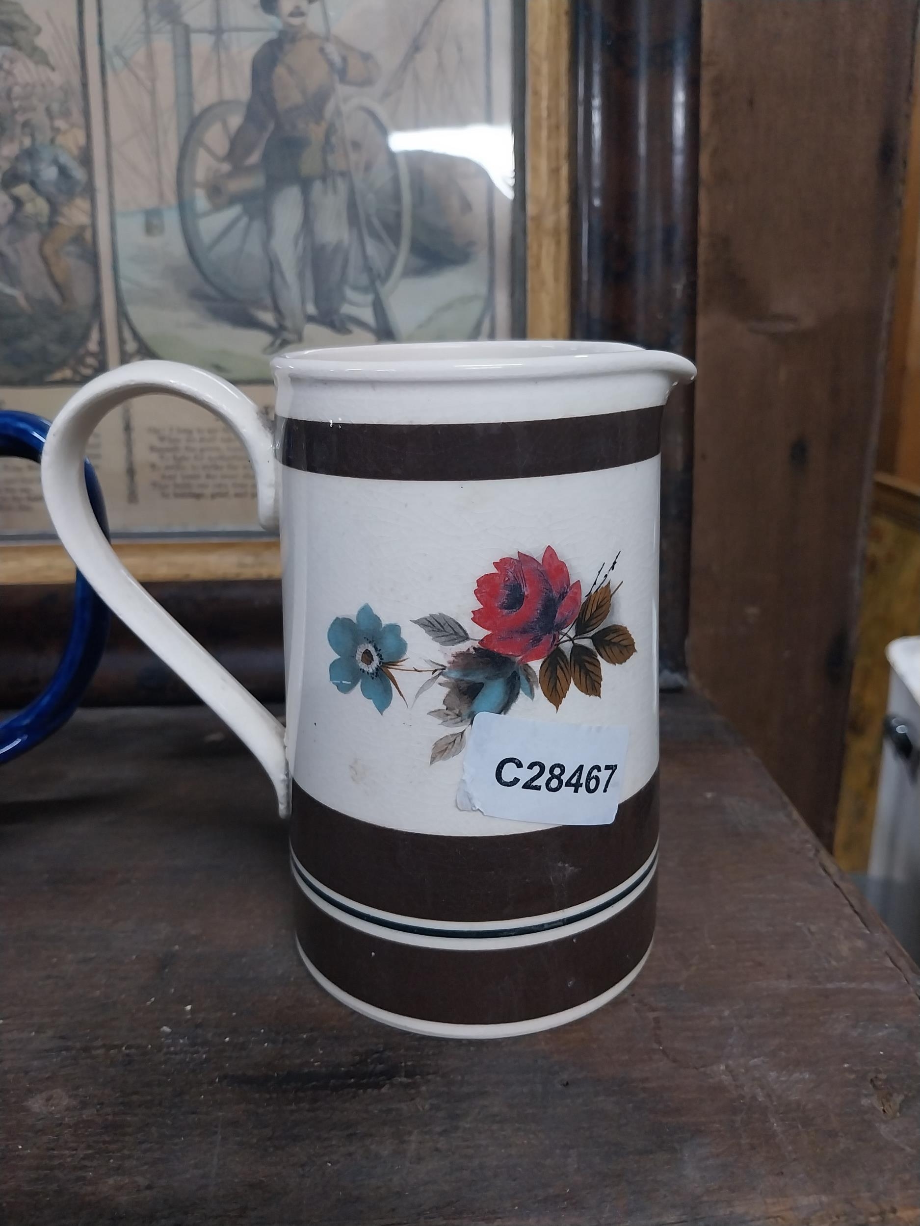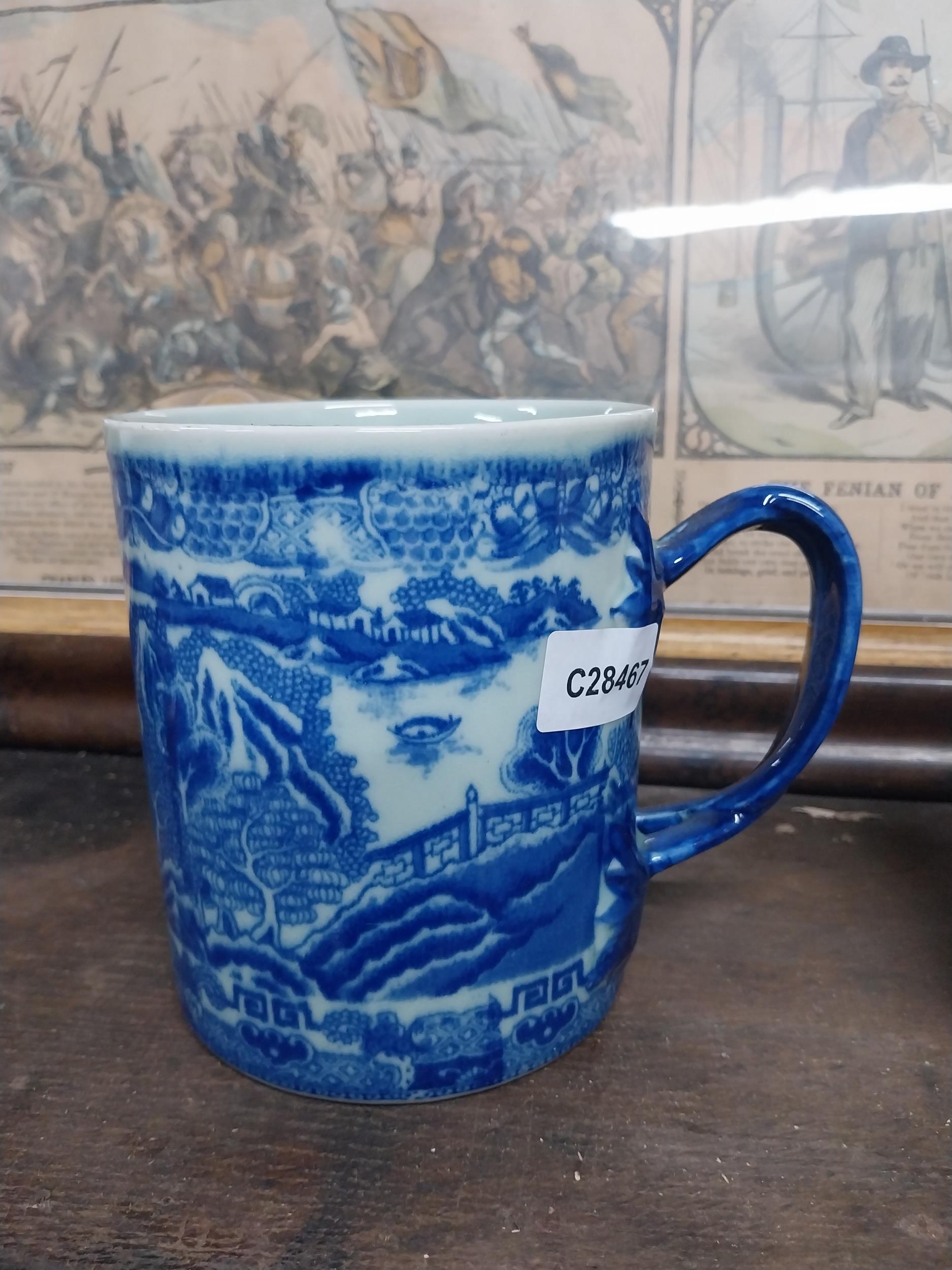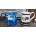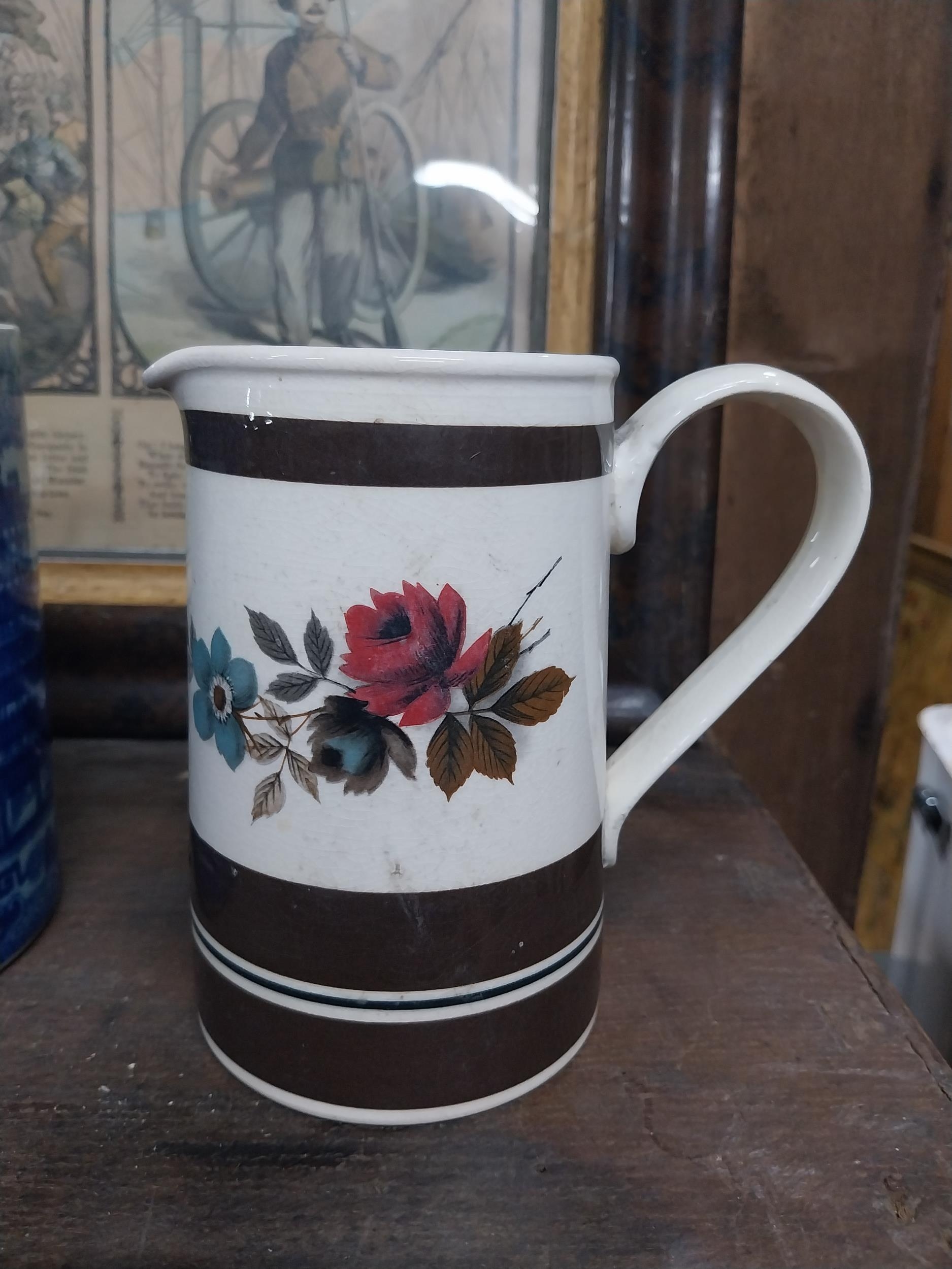 Large blue and white Willow pattern mug and brown jug decorated with flowers. {14 cm H x 17 cm Dia and 14 cm H x 13 cm W x 8 cm D}.