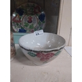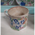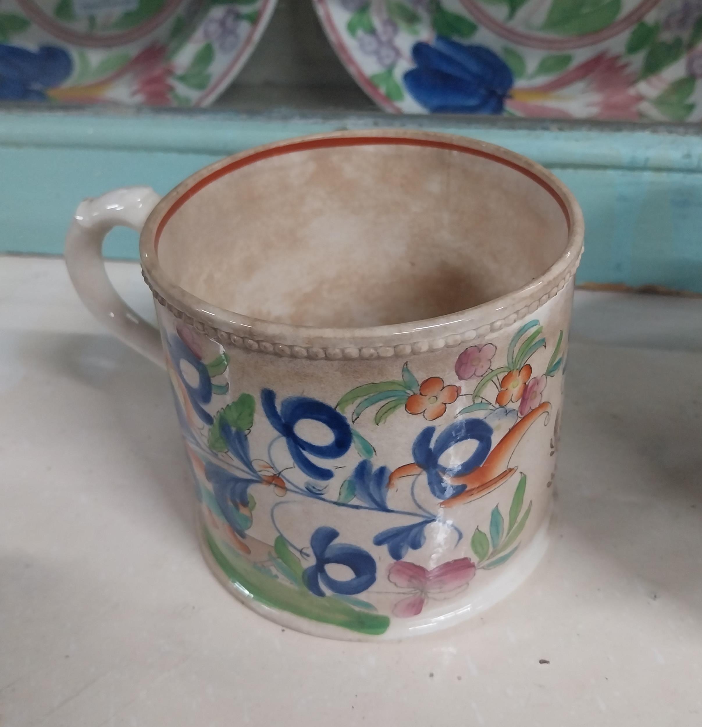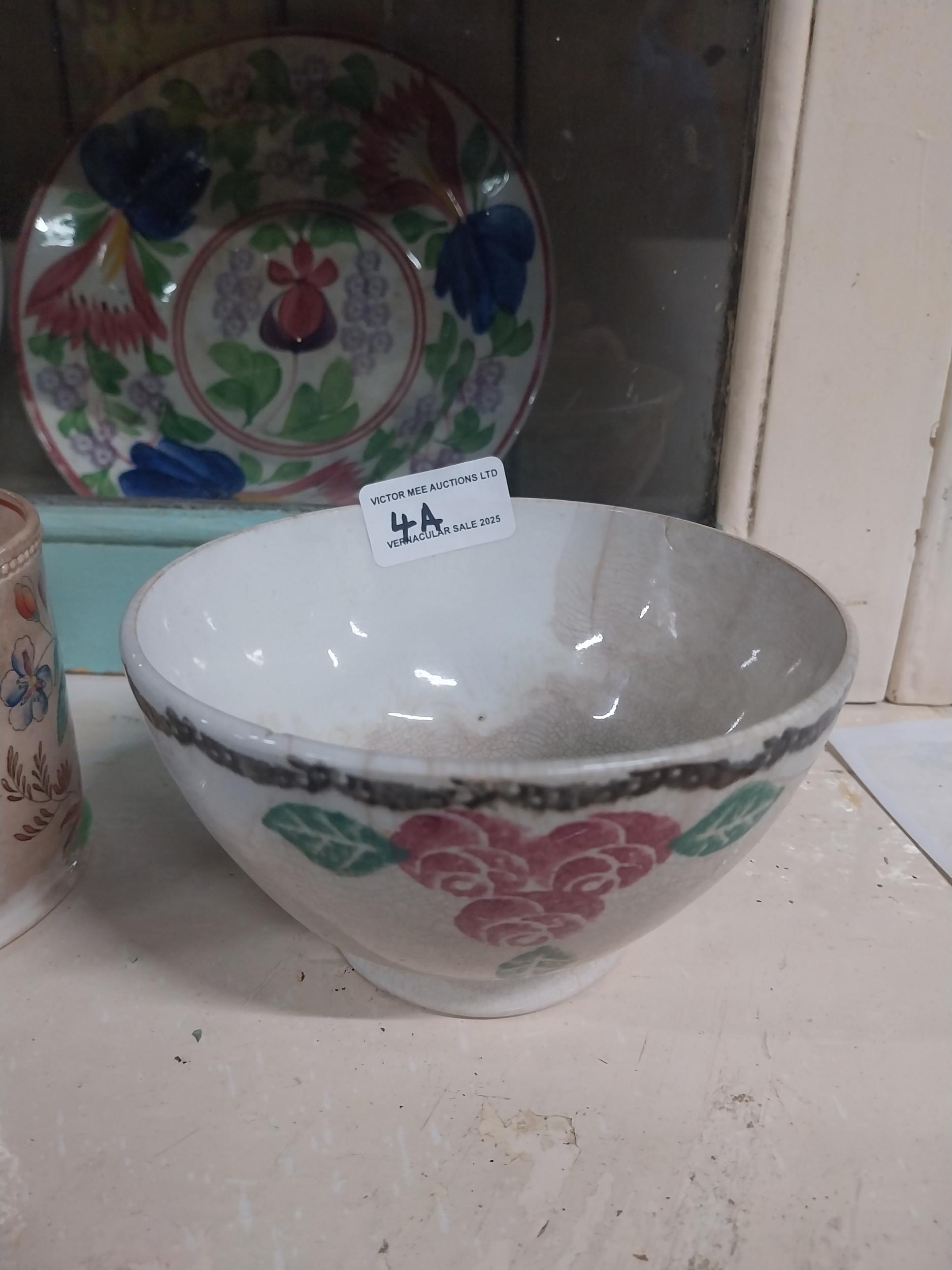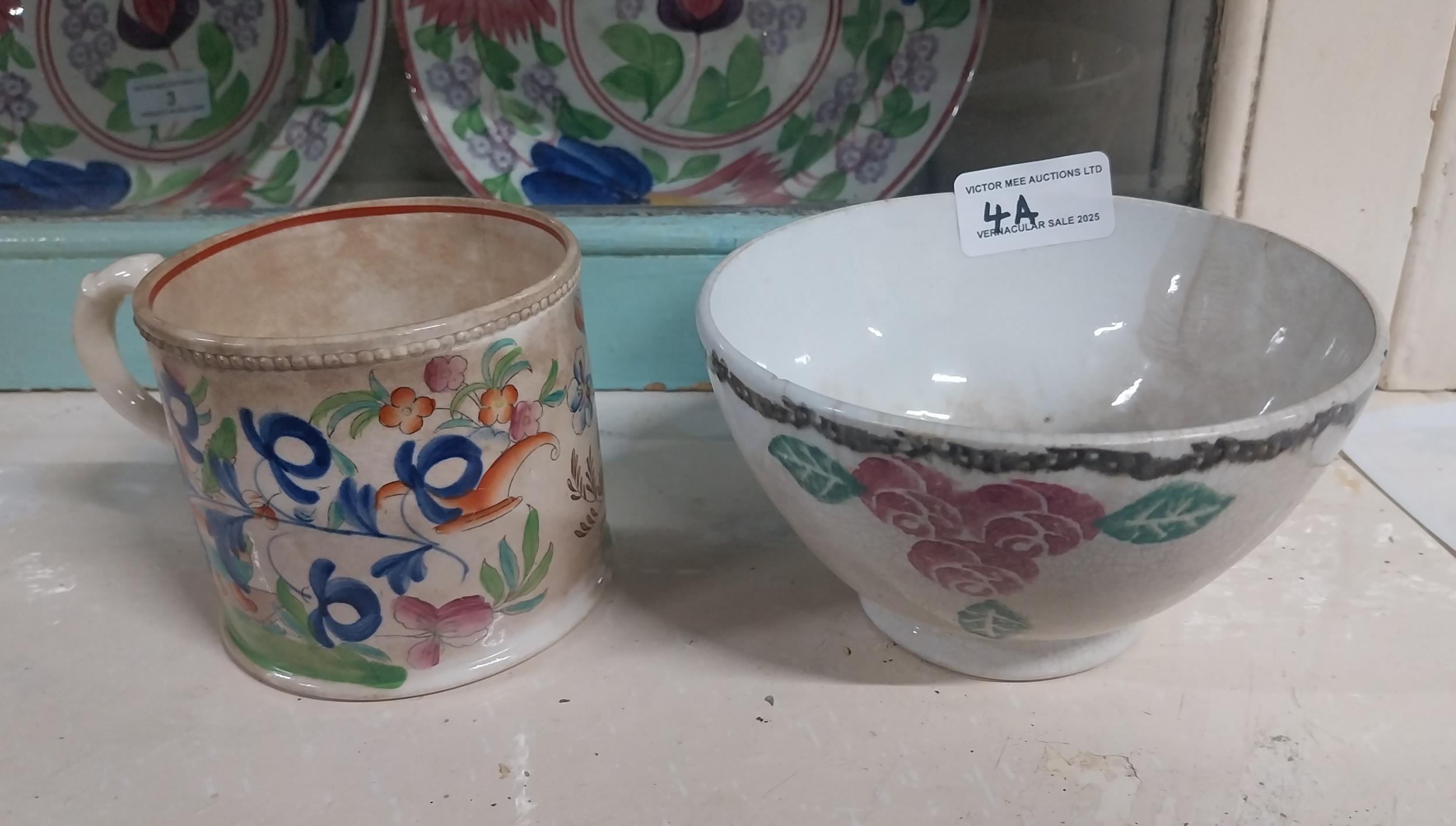 19th C. spongeware porridge bowl {8 cm H x 13 cm Dia.} and early 20th C. transferware mug with foliage {9 cm H x 13 cm W x 10 cm D.}.