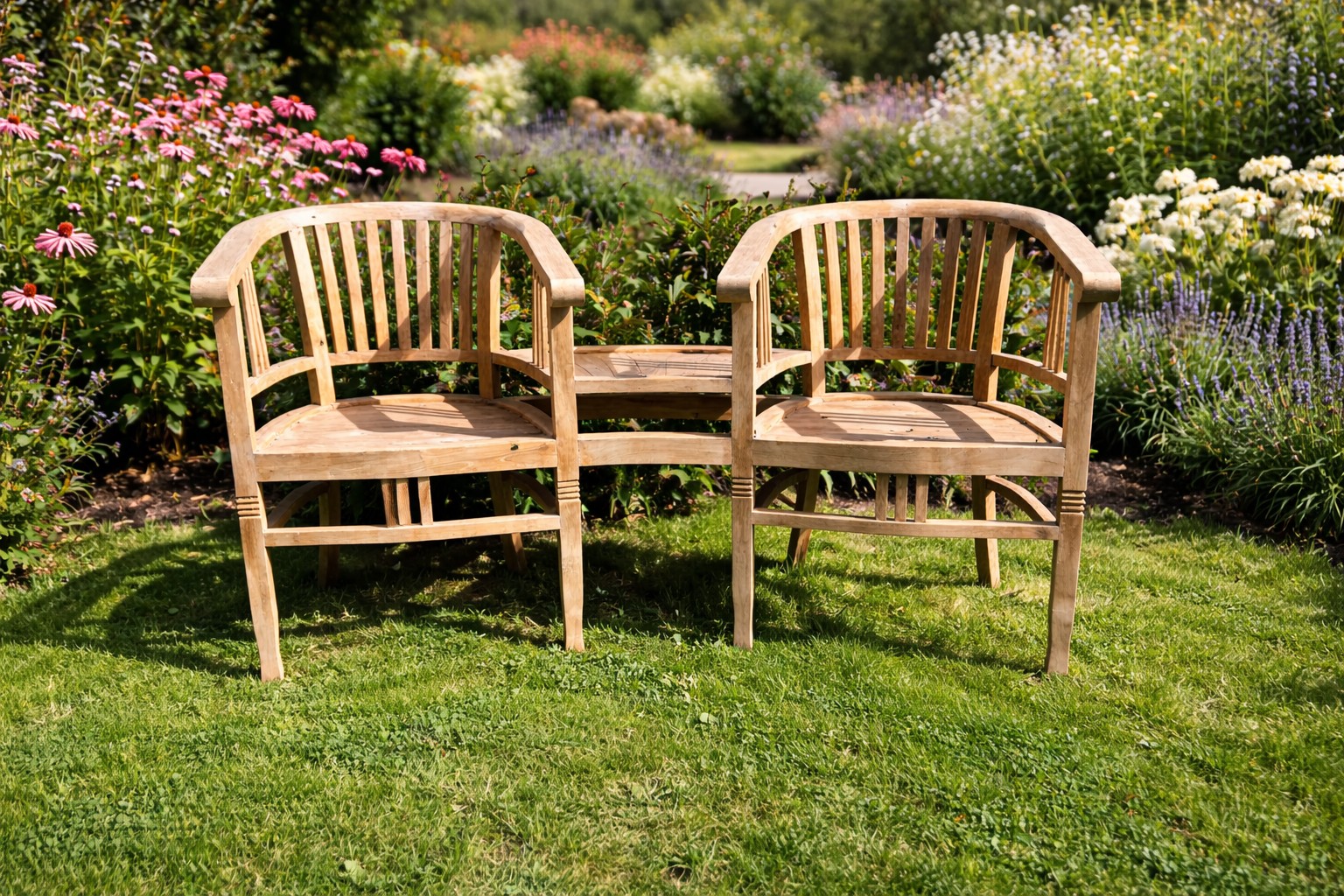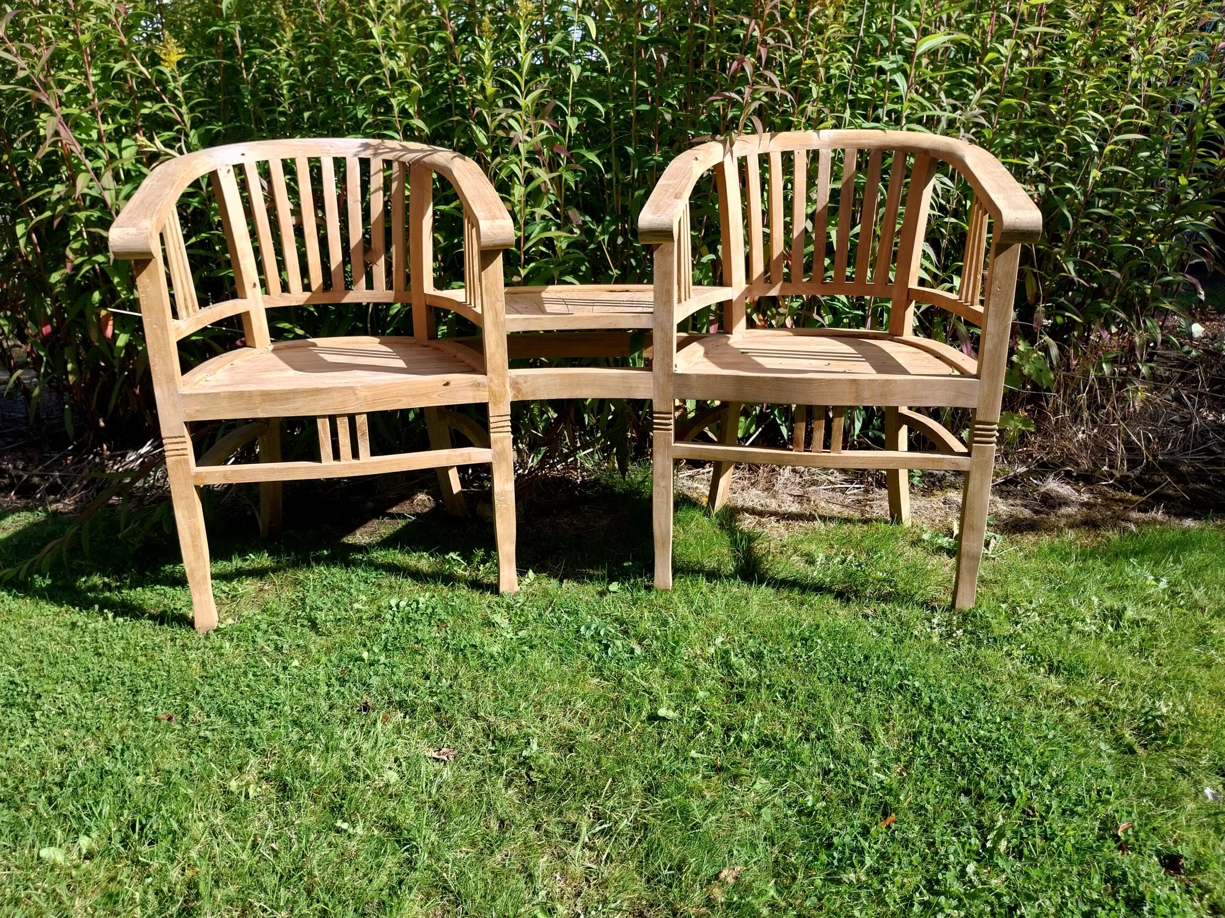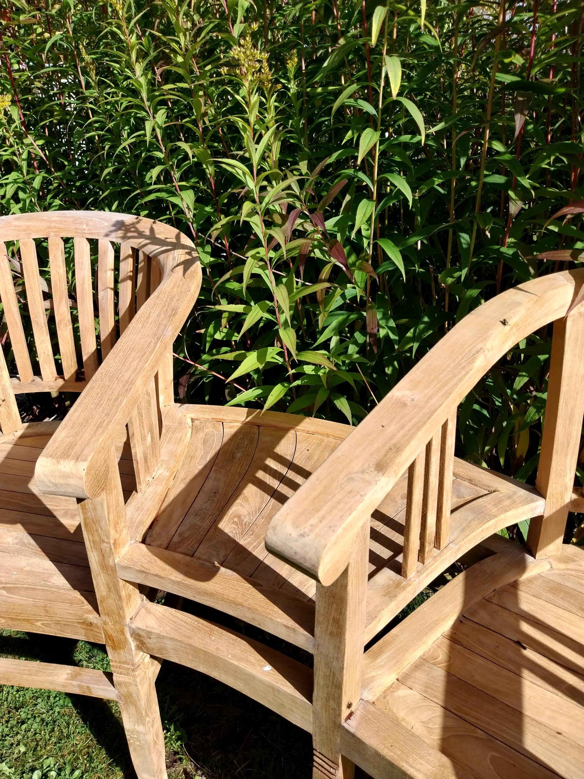 Good quality teak conversation seat. { 86cm H X 153cm W X 66cm D }.