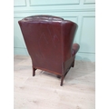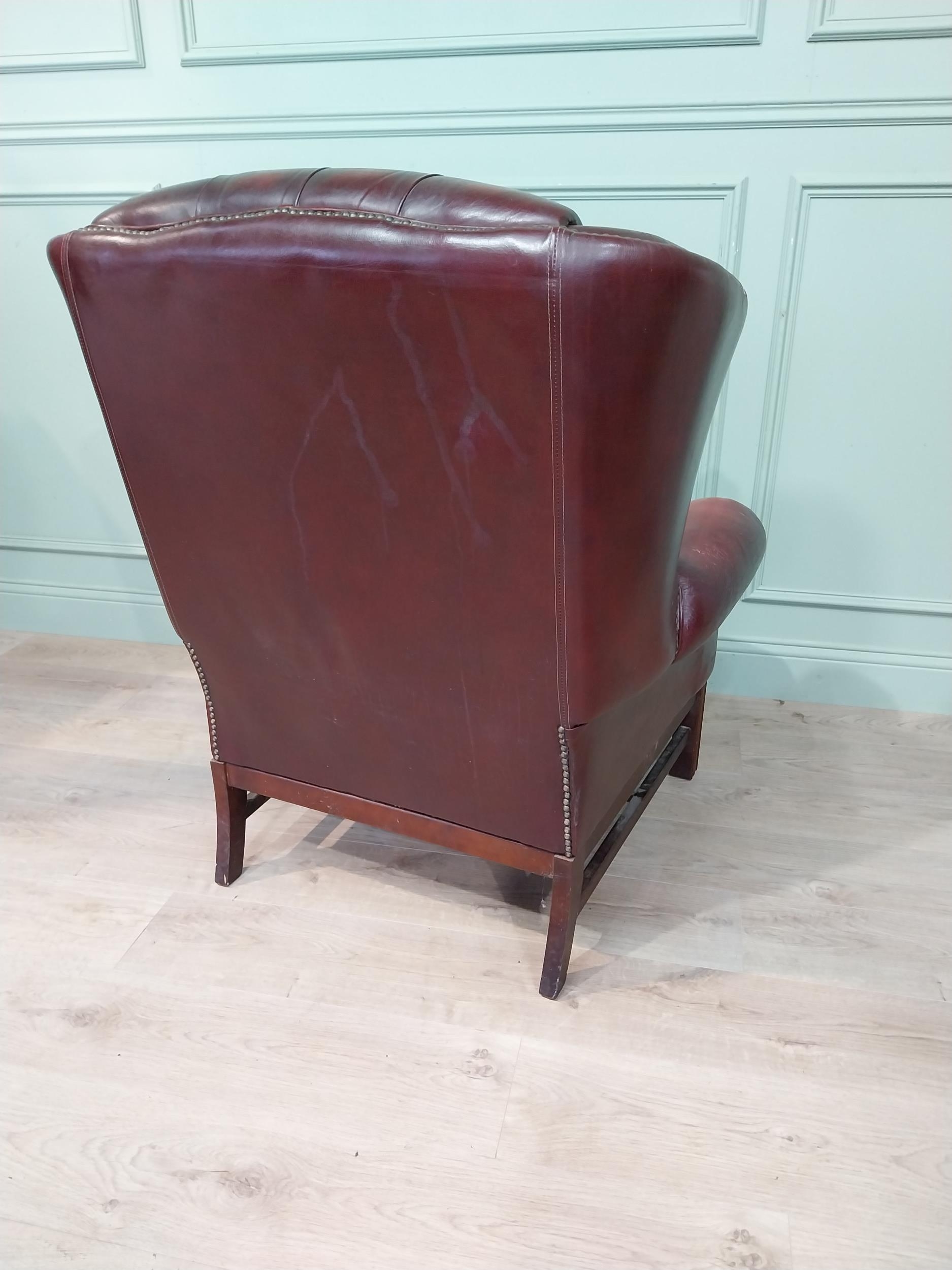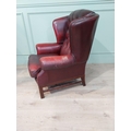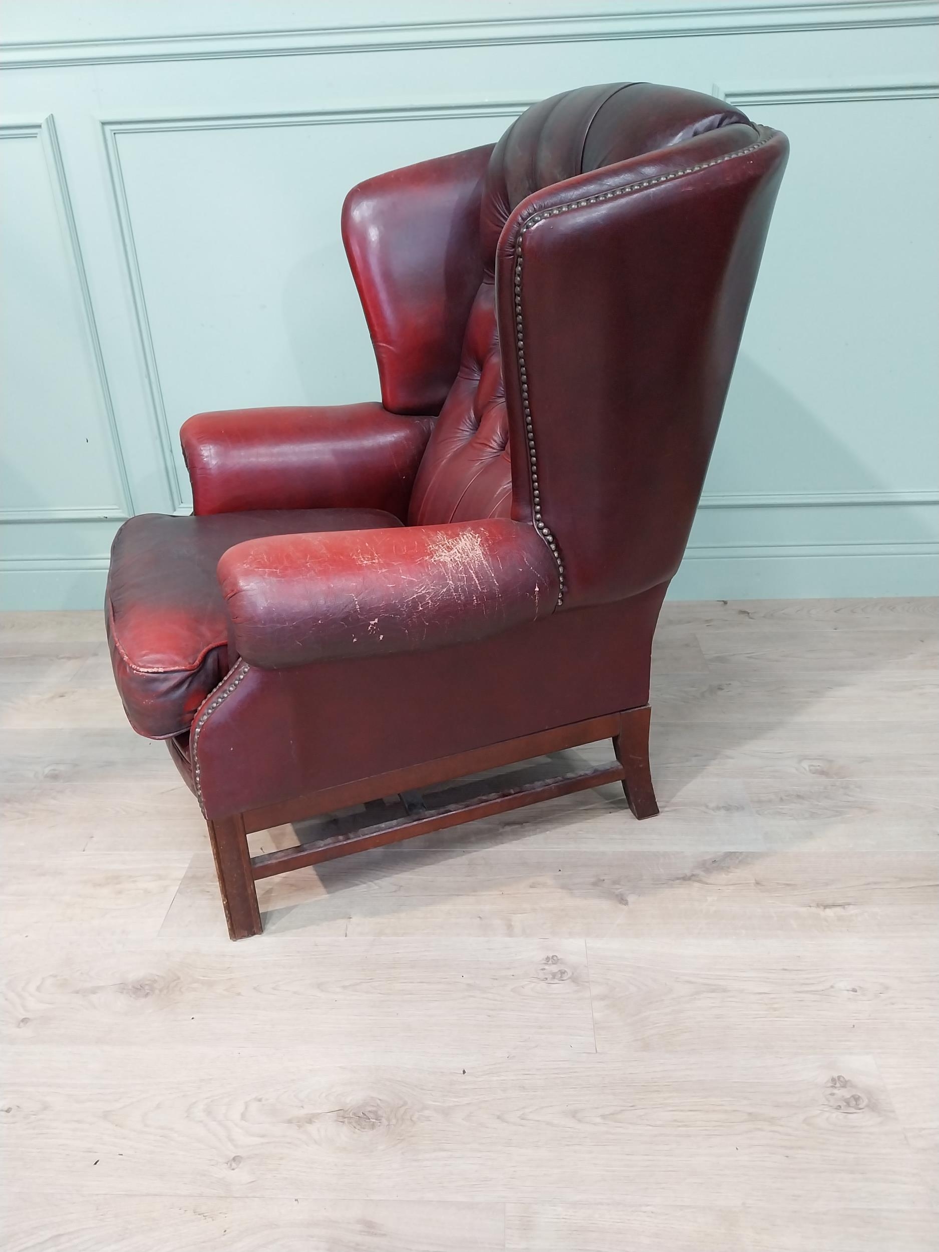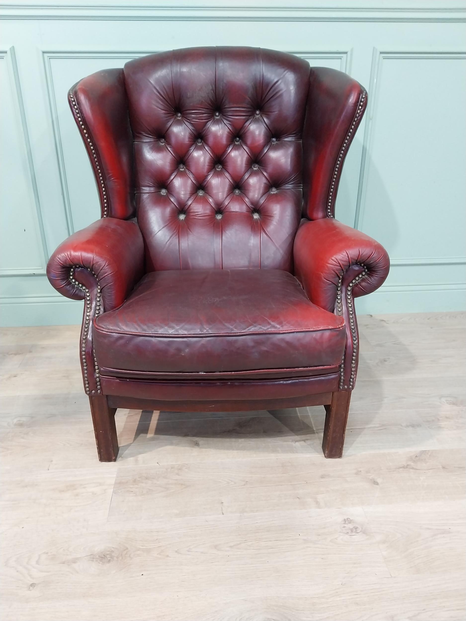 Oxblood leather deep buttoned Chesterfield wingback armchair. {106 cm H x 90 cm W x 90 cm D}.